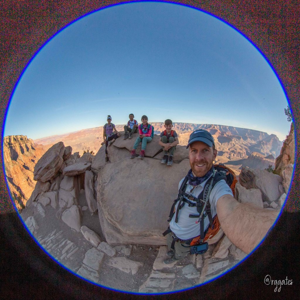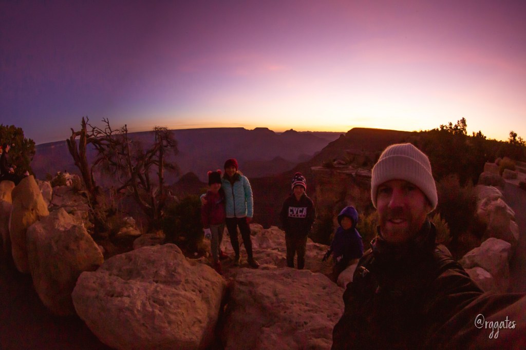 We set the kids’ expectations long before the early morning, and they were really good about getting up and getting moving without complaint. The drive was pretty non-descript in the dark, and nautical twilight emerged as we approached the parking lot. It was cold, but we were ready. We set up on the rim just west of Mathern Point and watched the sun rise over Kaibab. Gorgeous.