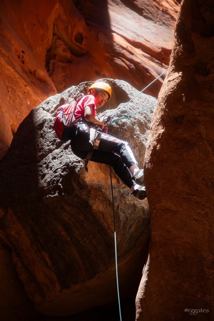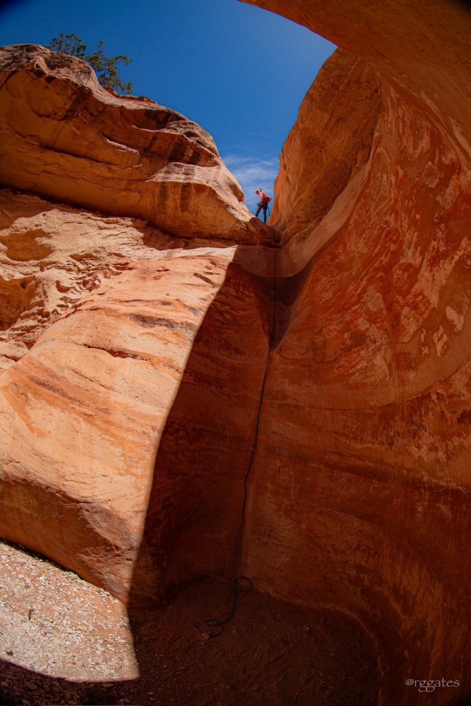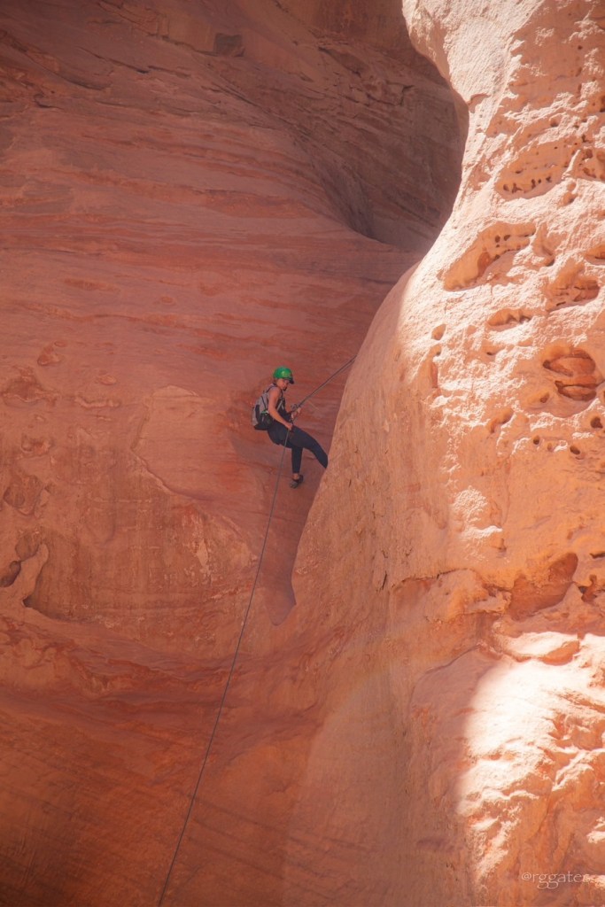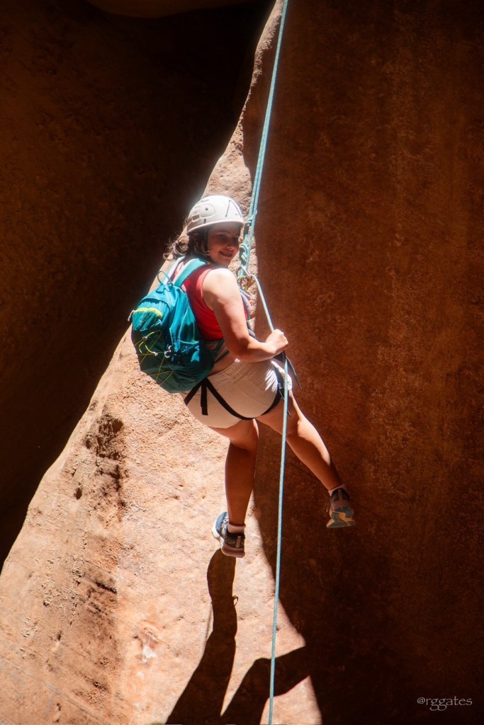 The following morning we met Tim with Capitol Reef Adventure Company at Chuckwagon General Store (the gold standard of general stores!) and followed him to the Sunglow Campground in the Fish Lake National Forest. The Middle Ranger Trail wandered along some spring fed greenery and then up a steady climb to arrive at the canyon’s start. (The USGS calls this Red Canyon. It has many other names, including Pete’s Dragon on the CRAC website, and there are other locations also named Red Canyon. I’m told Search & Rescue lOvEs these multiple names.) We scrambled and shimmied our way down some relatively short drops before we came to our first rappelling location.