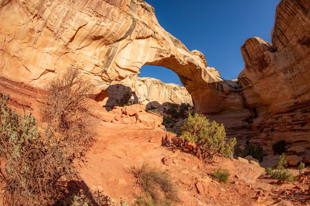 Before we took off, while Henry and Lydia took some early morning time to sleep in, Lincoln joined Jenn and me for a quick hike out to Hickman Bridge in Capitol Reef National Park. Unfortunately, our experience opportunities were limited in CRNP due to widespread road closures for maintenance. Even the scenic drive was unavailable. The trails were advertised as remaining open, but that was a little disingenuous because accessing the trailheads required parking on the road and walking miles in, adding significantly to the distance to travel.
